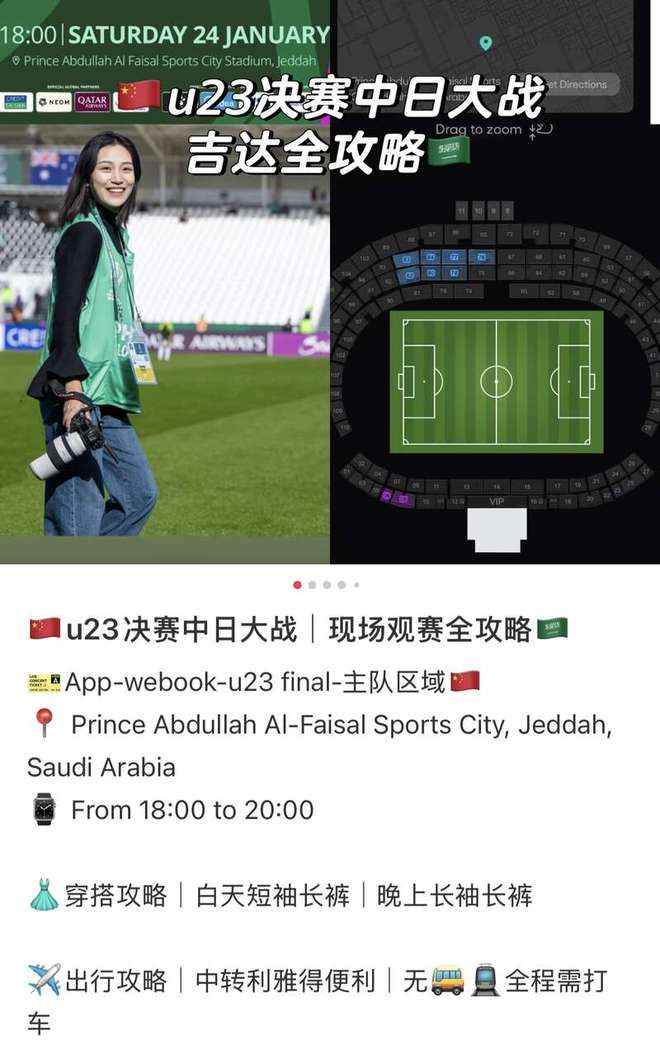 中国球迷在社媒发布攻略,为到吉达支持U23国足的球迷指路。某社交媒体平台截图