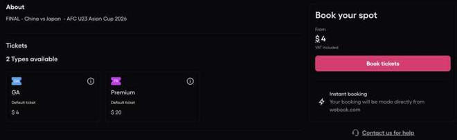 在官方票务平台Webook上,U23亚洲杯中日决赛的门票普通票为4美元(约28元人民币),高级门票为20美元(约140元人民币)。